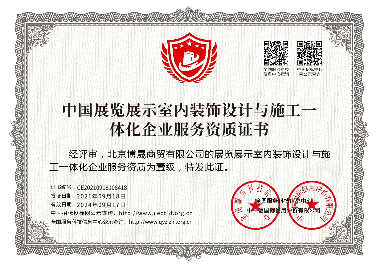 北京博晟廣告會展公司是北京博晟商貿有限公司旗下廣告會展品牌,公司于2008年創立,秉承“用戶第一、誠信、簡單、極致、創新”的理念,專注廣告會展12年,是一家集展會設計搭建、商業美陳、展覽展臺搭建、舞臺搭建、北京戶外廣告搭建、北京展覽工廠于一體的的綜合性公司。常年提供展覽展示、戶外廣告、商業美陳等綜合性服務。常年為各大企業提供展覽展示、發布會、會議論壇、路演巡展、酒會答謝會、慶典儀式、開盤開業年會等綜合性服務。