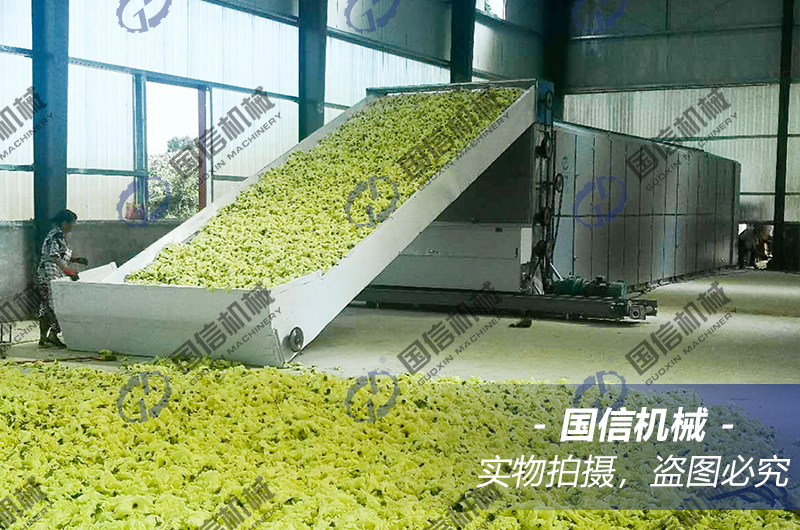 大型農產品烘干機之所以能夠實現高效的黃蜀葵烘干加工,主要是因為采用的是網帶式多層循環翻轉動態式穿流烘干模式,通過這種網帶式烘干機的自動上料裝置,可以將采摘后的新鮮黃蜀葵花朵,直接均勻的平鋪到不銹鋼網帶上,然后自動送入烘干機主機內部,進行烘干。