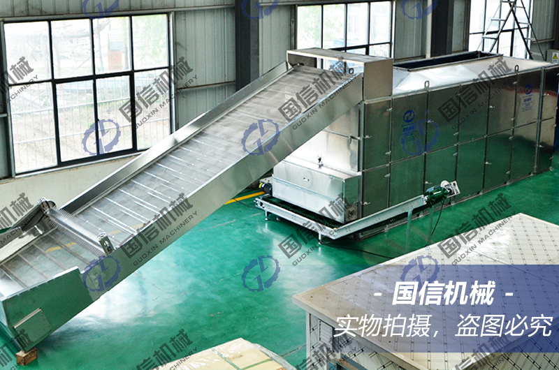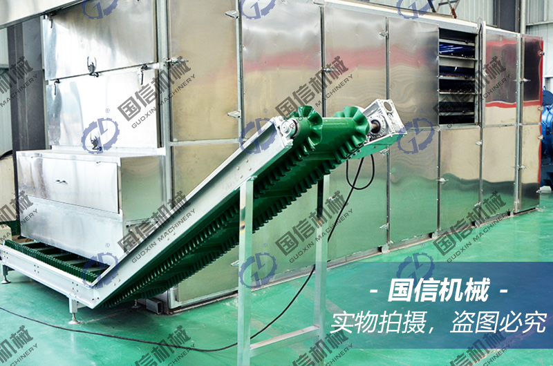 另外一種全自動化加工模式的網(wǎng)帶式食用菌烘干機設備,主要是針對產(chǎn)量非常大的客戶推出的,每天的建議加工量為六千斤至萬斤以上。干制加工時,只需將清洗挑揀處理好的菌菇放入上料輸送機即可,在設備內(nèi)部采用的是多層網(wǎng)帶結(jié)構(gòu),通過智能化的控制系統(tǒng)能夠讓菌菇自動上料,進入烘干主機,然后在主機內(nèi)部緩慢勻速移動,在主機內(nèi)部會經(jīng)過4~6次的翻層轉(zhuǎn)換,逐步向出料口移動,與此同時,熱風會從烘干機底部向上穿過載有食用菌的網(wǎng)帶層,對菌菇進行干制,并帶走其中的水分,從而實現(xiàn)逐層干制菌的目的。