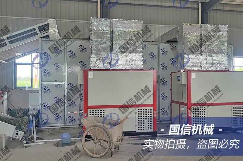干艾葉是將新鮮的艾葉曬干或者烘干之后制作而成的,其中的水分幾乎完全消失,微生物含量也大大減少,因此不容易出現腐爛現象,保存時間比較長,使用時性價比相對較高,所以產量大的種植戶都選擇烘干設備來烘干艾葉,這是我們湖北黃岡的客戶烘干艾葉的現場。這臺設備長8米6層,熱源是2臺空氣能熱泵主機,采用智能控溫控濕顯示器,可24小時不間斷烘干加工,能烘干多種物料,整條線兩三個人就能操作,烘干一天能出干貨5-10噸.
