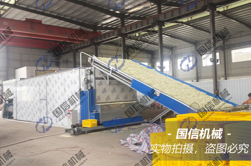 國信機械蘿卜條烘干機、蘿卜絲烘干生產線是根據蘿卜的特性和含水量以及適合蘿卜的科學干燥曲線相接合,在烘干設備的縱橫方向設置多個溫區,蘿卜在烘室內從上到下的段落回轉移動過程中自然翻動,經過不同溫區,依次實現預熱干燥-勻速干燥-減速干燥三個干燥過程,其表面受熱均勻,更好的實現蘿卜適干率高、干燥快、色澤好,達到優質高效的干燥作業結果。 能夠滿足工業生產蘿卜加工要求,保全蘿卜固有的品質,營養成份不流失。生產過程中無任何污染,設備和加工工藝達到國家藥品、食品衛 生標準。