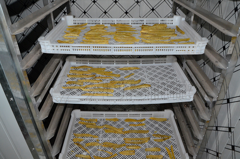 第一階段:待烘干房溫度升至大約30℃時將紅薯條放入烘房內部。設定溫度為40℃,烘干時間1-2小時;
