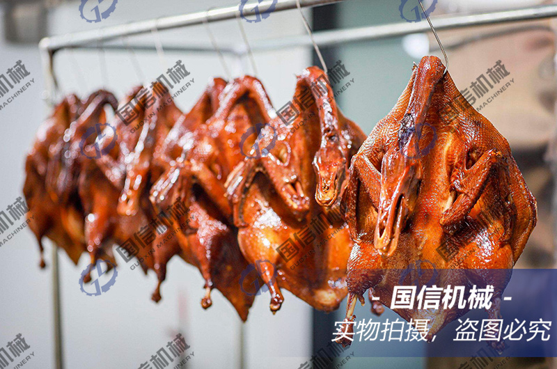 板鴨烘干工藝以及板鴨烘干機使用方法:將擦干之鴨體加以整型,將其掛入竹杠上,放入空氣能板鴨烘干房。以空氣能板鴨烘干機為例設置烘干參數,首先45~50℃熱風干燥約6小時后,移置于約15℃冷風處冷卻5~8小時,使鴨體定型,并可使皮膚出現乳白色,如用一次烘干時,則皮膚易變暗褐色,外觀不良。冷卻后之鴨只再以45~50℃熱風干燥。